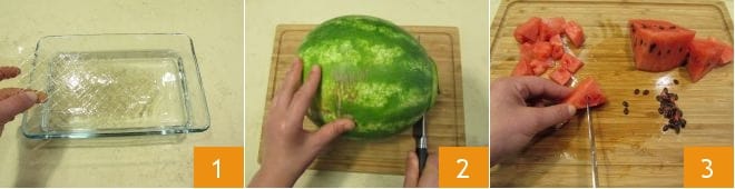 Um den Wassermelonenring mit Moscato zuzubereiten, beginnt ihr damit, die Gelatine für mindestens 10 Minuten in kaltem Wasser einzuweichen 1. In der Zwischenzeit nehmt eine Wassermelone und schneidet die Enden ab 2, dann schneidet das Fruchtfleisch grob 3 und entfernt die Kerne.