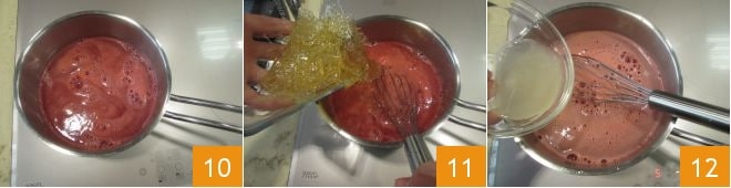 Gießt die Flüssigkeiten in einen Topf mit hohem Rand und erhitzt sie bei schwacher Hitze 10. Fügt die eingeweichte und gut ausgedrückte Gelatine hinzu 11 und den Zitronensaft 12.