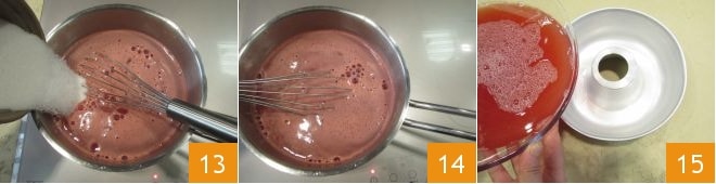 Gebt auch den Zucker hinzu und vermischt die Zutaten, um sie zu verbinden 14. Es dauert etwa 5-6 Minuten, bis sich die Zutaten aufgelöst haben. Gießt die Mischung dann in eine Ringform mit einem Fassungsvermögen von 1,5 kg 15.