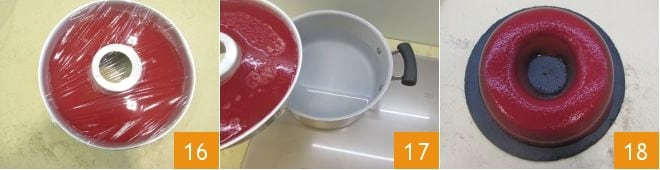 Bedeckt sie mit Frischhaltefolie 16 und stellt sie für mindestens 12 Stunden in den Kühlschrank, um fest zu werden. Nach dieser Zeit füllt einen Topf zur Hälfte mit Wasser. Es ist wichtig, dass der Topf einen etwas größeren Umfang hat als die Ringform, in die ihr die Mischung gegossen habt. Bringt das Wasser zum Kochen und stellt die Form mit der Zubereitung darüber 17, damit die Wärme das Lösen des Desserts aus der Form ermöglicht. Es dauert nur ein paar Sekunden. Dann nehmt die Form mit Hilfe von Schaufeln aus dem Topf, legt eine Servierplatte darauf und dreht beides gleichzeitig auf eine flache Oberfläche um. Entfernt dann die Form und serviert euren Wassermelonenring mit Moscato 18! Wenn ihr möchtet, könnt ihr ihn mit einigen Wassermelonenstücken oder Beeren servieren.