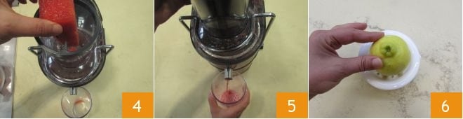Gebt die Wassermelonenstücke in eine Saftpresse, um das Fruchtfleisch vom Saft der Frucht zu trennen 4: Ihr erhaltet 1,3 kg Wassermelonensaft 5: Stellt ihn beiseite. Presst nun die Zitrone aus 6.