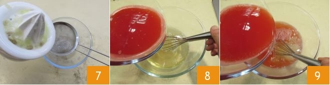 Siebt den Zitronensaft durch ein feines Sieb 7 und stellt ihn ebenfalls beiseite. Nehmt nun eine große Schüssel und gebt den Moscato und den Wassermelonensaft hinein 8. Vermischt die Zutaten mit einem Schneebesen 9.