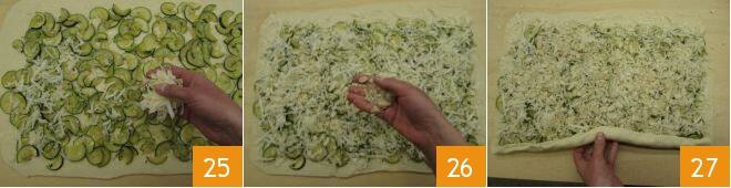 Bedeckt die gesamte Fläche mit den Zucchini, dem geriebenen Caciocavallo-Käse 25 und den Mandelblättchen 26. Rollt von der langen Seite aus auf 27 und passt auf, dass die Füllung nicht herausquillt. Versiegelt die Ränder gut und lasst sie 30 Minuten im Kühlschrank fest werden.
