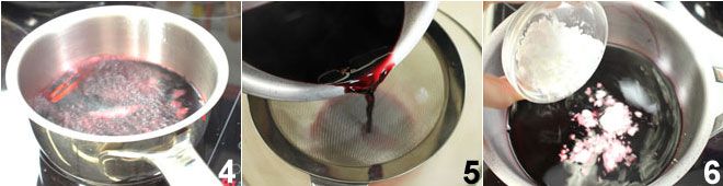 In der Zwischenzeit widmen Sie sich der Zubereitung des Glühweinreduktions: Erhitzen Sie den Rotwein in einem kleinen Topf, fügen Sie die Zimtstange, die Nelken und die Orangenschale hinzu. Wenn der Wein zu köcheln beginnt, zünden Sie ihn mit einem Feuerzeug an, um den Alkohol zu entfernen 4 und lassen Sie ihn bei niedriger Flamme weitere 10 Minuten auf dem Herd. Nehmen Sie ihn vom Herd und lassen Sie ihn ruhen. Filtern Sie alles mit einem Sieb 5 und stellen Sie es wieder auf mittlere Hitze auf den Herd. Nun fügen Sie die Maisstärke hinzu 6 und rühren mit einem Löffel, bis die gewünschte Konsistenz erreicht ist.
