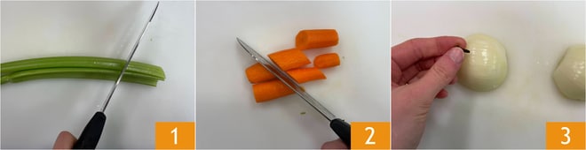 Um die Anolini zuzubereiten, schneiden Sie zuerst den Sellerie 1 und die Karotten 2 in Stücke. Halbieren Sie die Zwiebeln und stecken Sie die Nelken hinein 3.