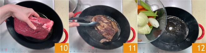 Fügen Sie das Rindfleisch hinzu 10 und braten Sie es von allen Seiten an 11. Nehmen Sie das Fleisch heraus, fügen Sie weiteres Öl hinzu, das in Stücke geschnittene Gemüse 12 und braten Sie es einige Minuten an.