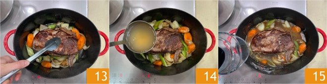 Geben Sie das Fleisch zurück in den Topf 13, fügen Sie 500 g Kapaunbrühe 14 und den Rotwein hinzu 15.