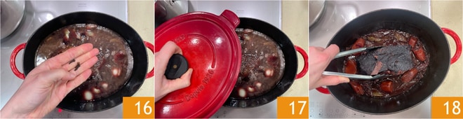 Fügen Sie die Nelken hinzu 16, decken Sie den Topf mit einem Deckel ab 17 und lassen Sie es bei mittlerer bis niedriger Hitze 4-5 Stunden kochen, wobei Sie das Fleisch gelegentlich wenden 18, damit es immer im Sud liegt. Am Ende sollten Sie einen stark reduzierten, sehr dichten Kochfond haben. Wenn dies nicht der Fall ist, erhöhen Sie die Hitze für einige Minuten ohne Deckel.