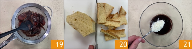 Nehmen Sie das Fleisch heraus, welches nicht für die Anolini verwendet wird: Es eignet sich hervorragend als zweiter Gang, begleitet von einem einfachen Salat oder gegrilltem Gemüse. Filtern Sie den Rest durch ein Sieb in eine Schüssel 19, Sie sollten etwa 200 g erhalten. Vom Brot nehmen Sie die Krume 20. Fügen Sie den Parmesan dem Kochfond hinzu 21.