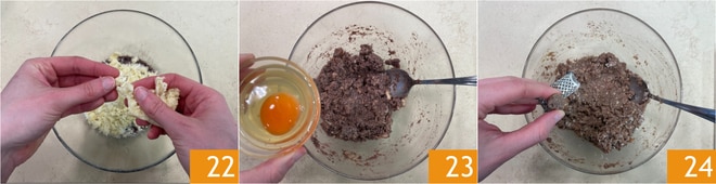 Fügen Sie auch die Krume hinzu 22 und mischen Sie alles gut. Fügen Sie dann das Ei 23 und die Muskatnuss 24 hinzu.