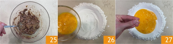 Mischen Sie alles, um eine homogene Mischung zu erhalten 25, und stellen Sie sie beiseite. Für die Zubereitung der frischen Nudeln geben Sie das Mehl zu einem Brunnen geformt und die geschlagenen Eier hinein 26. Fügen Sie eine Prise Salz hinzu 27.