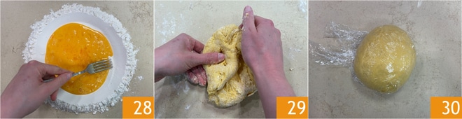 Integrieren Sie das Mehl nach und nach mit einer Gabel 28 und kneten Sie dann mit den Händen 29, bis Sie einen glatten und homogenen Teig erhalten. Decken Sie ihn mit Frischhaltefolie ab und lassen Sie ihn 20 Minuten im Kühlschrank ruhen 30.