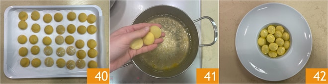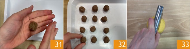Inzwischen nehmen Sie 7 g Füllung pro Mal und formen Sie Kugeln 31, die Sie auf ein Tablett legen, während Sie sie formen 32. Nehmen Sie den Teig wieder auf, teilen Sie ihn in zwei Hälften 33.