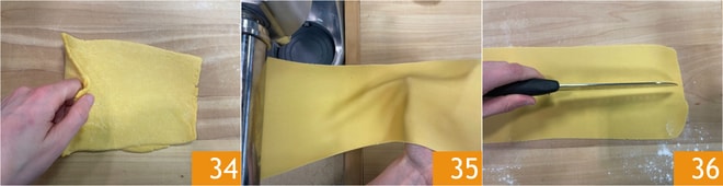Flachen Sie jeden Teig ab und falten Sie den Teig, um ihn durch die Walze zu führen 34. Fahren Sie fort, den Teig durch die Nudelmaschine zu geben und verringern Sie dabei nach und nach die Dicke, bis Sie zwei Teige von 2 mm Dicke erhalten 35. Schneiden Sie diese in der Mitte 36.