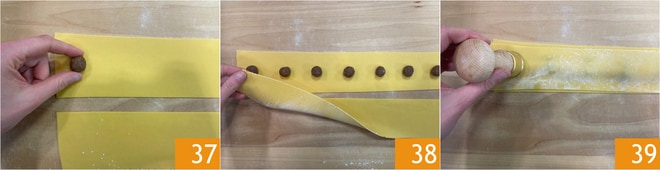 Legen Sie die Füllungskugeln auf eine Hälfte, etwa 3 cm auseinander 37, schließen Sie sie mit der anderen Hälfte 38 und formen Sie die Anolini mit dem entsprechenden Ausstecher 39 oder einem runden Ausstecher von 3,5 cm Durchmesser.