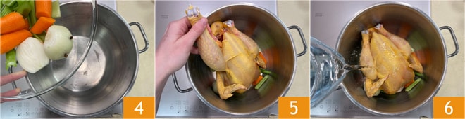 Geben Sie das Gemüse 4 und den Kapaun 5 in einen Topf. Decken Sie es mit Wasser ab 6 und kochen Sie es bei niedriger Hitze, mit einem leichten Simmern, für mindestens 1 Stunde.