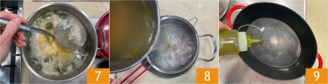Entfernen Sie gelegentlich den Schaum 7, der sich an der Oberfläche bildet, um die Brühe sauberer zu halten. Nehmen Sie das Fleisch und das Gemüse heraus, filtern Sie die Brühe in einen anderen Topf und halten Sie sie warm 8. In einem gusseisernen Topf geben Sie das Öl hinzu 9.