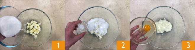 Um den Apfel-Karamell-Kuchen zuzubereiten, geben Sie die Butter, den Zucker 1 und das Salz 2 in eine Schüssel, kneten Sie von Hand und fügen Sie dann das Ei 3 hinzu.