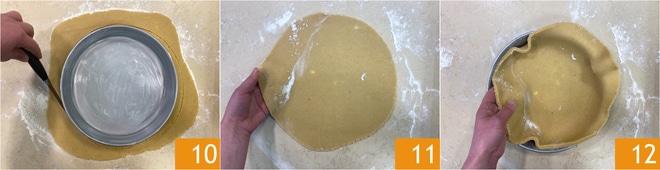Legen Sie auf den Teig eine 22 cm große Form und schneiden Sie eine Scheibe 10 etwas größer als die Form, um den Boden und die Ränder 11 zu bedecken. Setzen Sie den Mürbeteig in die gebutterte Form 12 und drücken Sie ihn gut an 12.
