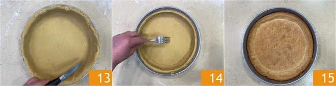 Schneiden Sie den Rand mit einem Messer ab, um ihn zu senken 13, stechen Sie den Boden mit einer Gabel ein 14 und backen Sie ihn im vorgeheizten statischen Ofen bei 180°C für 15 Minuten. Nach dem Backen herausnehmen und abkühlen lassen 15.