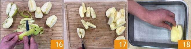 Bereiten Sie die Äpfel vor: Schälen Sie sie 16 und schneiden Sie sie in Spalten 17, legen Sie sie auf ein mit Backpapier ausgelegtes Blech 18.