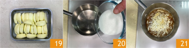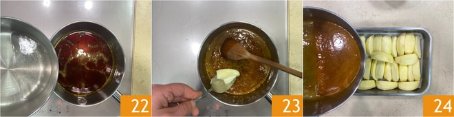 Wenn es fertig ist, gießen Sie das kochende Wasser in zwei Portionen 22 hinein, rühren Sie um, um es zu mischen, schalten Sie dann die Hitze aus und fügen Sie die Butter 23 hinzu. Gießen Sie das Karamell über die Äpfel 24.
