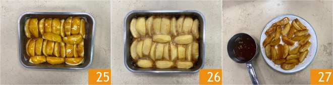 Geben Sie es in den vorgeheizten statischen Ofen bei 180°C für 30-40 Minuten 25. Herausnehmen 26 und das Karamell von den Äpfeln trennen 27.