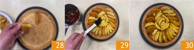 Verteilen Sie nun die Äpfel strahlenförmig auf dem Mürbeteig 28. Erwärmen Sie das Karamell und bestreichen Sie es über die Äpfel 29. Der Apfel-Karamell-Kuchen ist fertig, Sie können ihn nach Belieben mit Goldblättern verzieren 30.