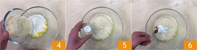 Nun fügen Sie die Mehle 4, das Backpulver 5 und den Zimt 6 hinzu.