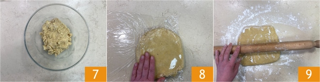 Kneten Sie, bis Sie eine homogene und glatte Masse 7 erhalten, formen Sie einen Laib, wickeln Sie ihn in Frischhaltefolie und stellen Sie ihn für 1 Stunde in den Kühlschrank 8. Rollen Sie den Mürbeteig mit einem Nudelholz 9 auf eine Dicke von 3 mm aus.