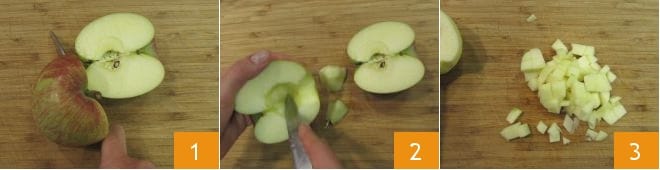 Um die Apfel-Ricotta-Krapfen zuzubereiten, schneiden Sie zuerst die Äpfel in zwei Hälften 1, entfernen Sie das Kerngehäuse 2 und schälen Sie sie. Schneiden Sie sie dann in Würfel von etwa 1 cm 3.
