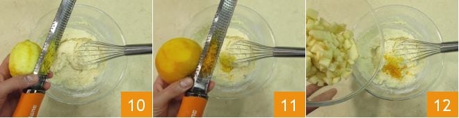 Mischen Sie, um diese Zutaten zu integrieren, und aromatisieren Sie dann den Teig mit abgeriebener Zitronenschale 10 und Orangenschale 11. Fügen Sie die Apfelwürfel 12 hinzu.