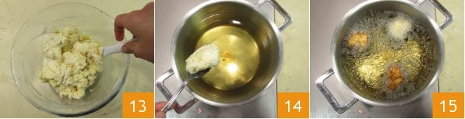 Und mischen Sie, um sie im Teig zu verteilen. Die Mischung ist bereit zum Kochen 13. Stellen Sie einen Topf mit hohem Rand auf den Herd und gießen Sie das Pflanzenöl hinein. Erhitzen Sie das Öl und wenn es 160° erreicht hat, tauchen Sie einen Löffel Teig hinein 14. Frittieren Sie einige Krapfen auf einmal etwa 8 Minuten lang 15 und wenn sie goldbraun sind,