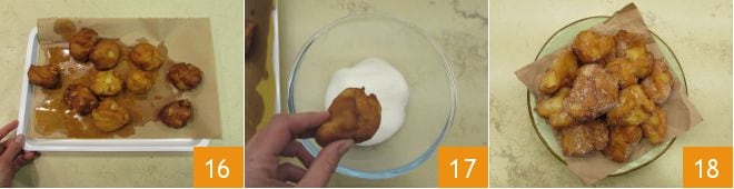 nehmen Sie sie auf einem mit Küchenpapier ausgelegten Tablett ab 16 und lassen Sie sie abkühlen. Zum Schluss in Zucker wälzen 17 und die Apfel-Ricotta-Krapfen warm servieren 18.