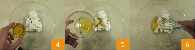 Geben Sie den gut abgetropften Ricotta, den Honig 4, das ganze Ei 5 in eine Schüssel und mischen Sie mit einem Schneebesen 6.