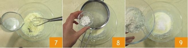Fügen Sie jetzt die Milch 7, das gesiebte Backpulver 8 und das Mehl 9 hinzu.