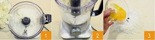 Um die Apfel- und Zimttörtchen zuzubereiten, beginnen Sie mit dem Mürbeteig: Geben Sie das gesiebte Mehl, den Puderzucker und die kalte Butter aus dem Kühlschrank in die Küchenmaschine 1. Starten Sie die Maschine, um eine sandige Mischung herzustellen 2, die Sie dann auf eine Arbeitsfläche schütten. Formen Sie einen klassischen Brunnen und geben Sie in die Mitte die Samen der Vanilleschote und die Eigelbe 3.