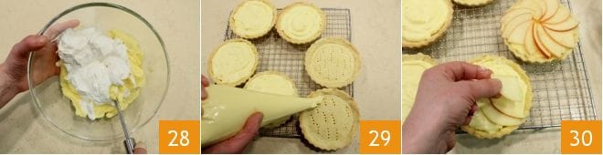 und fügen Sie sie vorsichtig der inzwischen kalten Creme hinzu. Mischen Sie mit einem Spatel von oben nach unten 28, dann geben Sie die Creme in einen Einwegspritzbeutel, dessen Öffnung Sie auf etwa 1 cm geschnitten haben. Füllen Sie die Törtchen mit der Creme 29 und legen Sie die abgetropften Apfelscheiben strahlenförmig darauf 30.