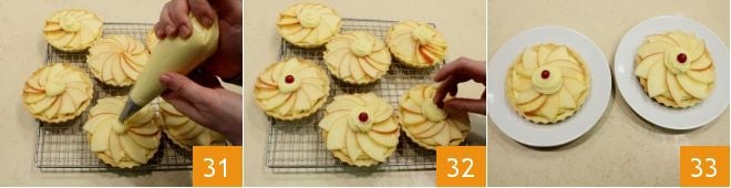Mit der restlichen Creme können Sie eine weitere Garnitur herstellen, vielleicht einen kleinen Klecks in der Mitte jedes Törtchens 31 und mit einer roten Johannisbeere dekorieren 32. Ihre Apfel- und Zimttörtchen sind bereit, genossen zu werden 33!