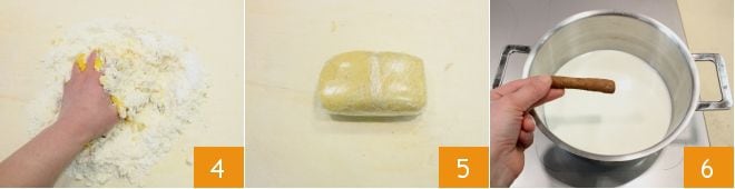 Verarbeiten Sie den Teig schnell 4 und formen Sie einen Laib; wickeln Sie ihn in Frischhaltefolie 5 und legen Sie ihn für mindestens 30 Minuten in den Kühlschrank. In der Zwischenzeit kümmern Sie sich um die Creme: Erhitzen Sie in einem Topf die Milch und 50 ml Sahne. Fügen Sie eine Prise Zimtpulver und die ganze Zimtstange hinzu 6.
