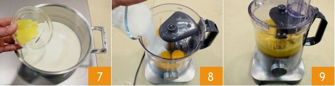 Ziehen Sie die Schale einer unbehandelten Zitrone ab und fügen Sie sie der Milch und Sahne hinzu 7. Während die Mischung auf dem Herd ist, geben Sie die Eigelbe in die Küchenmaschine und fügen Sie den Kristallzucker hinzu 8: Schalten Sie die Maschine ein, um die Zutaten zu pürieren 9.