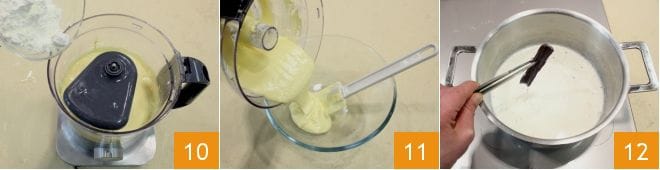 Wenn sie gut vermischt sind, fügen Sie die Maisstärke hinzu 10 und schalten Sie die Maschine erneut ein, um alles zu mischen. Übertragen Sie die erhaltene Creme in eine Schüssel 11. Sobald die Sahne und die Milch kurz vor dem Kochen sind, schalten Sie den Herd aus und entfernen Sie die Zitronenschale und die Zimtstange 12.