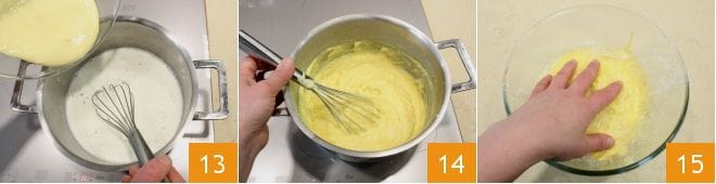 Gießen Sie den Eimix langsam in den Topf mit der Milch und der Sahne 13 und rühren Sie mit einem Schneebesen, um die Bildung von Klumpen zu vermeiden. Schalten Sie die niedrige Hitze ein und lassen Sie die Creme eindicken. Wenn sie eine cremige, glatte und klumpenfreie Konsistenz erreicht hat 14, legen Sie sie in eine Schüssel und bedecken Sie sie mit Frischhaltefolie 15, um sie vollständig abkühlen zu lassen.