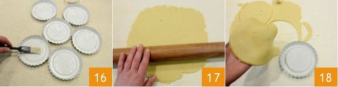 In der Zwischenzeit fetten 16 und mehlen Sie sorgfältig die Förmchen für die Törtchen mit einem Durchmesser von 12 cm. Nehmen Sie den Mürbeteig und rollen Sie ihn zu einer Scheibe von etwa einem halben Zentimeter Dicke aus 17. Schneiden Sie mit einem Ausstecher von 14 cm Durchmesser 6 Scheiben aus. Legen Sie jede Mürbeteigscheibe in die Förmchen 18;