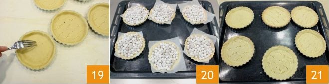 drücken Sie sie sorgfältig in die Form und stechen Sie den Boden mit einer Gabel ein 19, dann legen Sie ein Quadrat aus Backpapier und Keramikkugeln für das Blindbacken ein 20 (Sie können auch getrocknete Hülsenfrüchte wie Bohnen verwenden). Backen Sie die Törtchen in einem im Voraus auf 180°C erhitzten statischen Ofen für etwa 20 Minuten (wenn Umluftofen, bei 160°C für 10 Minuten). Sobald sie gebacken sind, nehmen Sie die Böden heraus 21 und lassen Sie sie abkühlen.