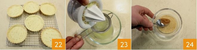 Dann legen Sie sie auf ein Gitter, um sie vollständig abkühlen zu lassen 22. In ein kleines Schälchen drücken Sie den Saft einer Zitrone und filtern ihn 23; mischen Sie separat den braunen Zucker und den Zimt 24 und fügen Sie ihn dem Zitronensaft hinzu.