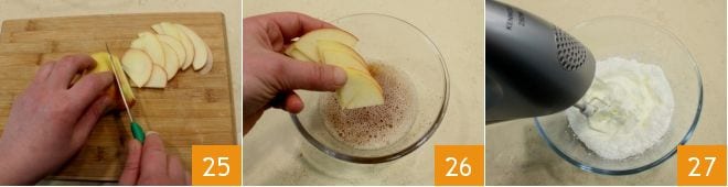 Schneiden Sie jetzt die Äpfel in dünne Scheiben von einigen Millimetern 25 und halbieren Sie sie. Tauchen Sie sie in das Schälchen mit dem Zitronensaft und dem braunen Zucker 26, damit sie nicht verfärben. Dann schlagen Sie in einer separaten Schüssel die Sahne 27