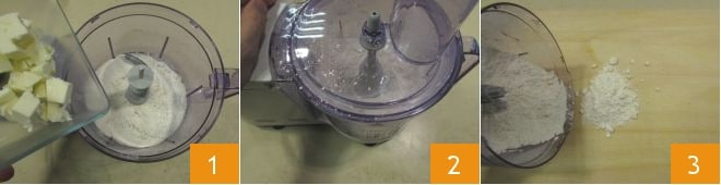 Um die Apfelkekse zuzubereiten, beginnt ihr mit der Zubereitung des Mürbeteigs: Gebt das Mehl in einen Mixer und fügt die kalte, in Stücke geschnittene Butter aus dem Kühlschrank hinzu 1. Schaltet den Mixer ein 2 und lasst ihn laufen, bis ihr einen sandigen Teig erhaltet, den ihr auf eine Arbeitsfläche gebt 3.