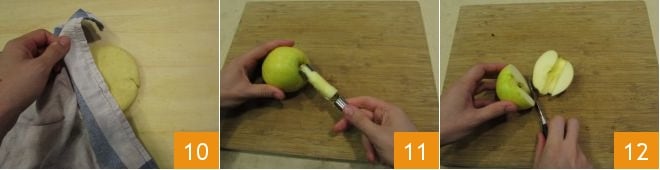 Deckt den Teig mit einem sauberen, trockenen Tuch ab 10 und lasst ihn ruhen. In der Zwischenzeit kümmert euch um die Äpfel: Entfernt das Kerngehäuse mit dem entsprechenden Werkzeug 11, dann halbiert die Äpfel 12.