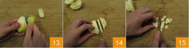 Schält sie 13, dann schneidet jede halbe Apfelhälfte in Scheiben 14 und dann in etwa halbe Zentimeter große Würfel 15.